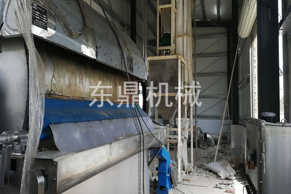在烘干的時(shí)候烘缸繞軸向轉(zhuǎn)動(dòng)且轉(zhuǎn)速可調(diào)整。漿料在預(yù)熱槽內(nèi)進(jìn)行預(yù)熱,預(yù)熱到50℃左右,用輸料泵輸入烘缸下部浸料槽內(nèi),烘缸浸入約60-80mm,旋轉(zhuǎn)的烘缸外表面便沾涂上一層均勻的漿料(即薄膜厚度),烘缸內(nèi)通入蒸汽壓力為0.15-0.3Mpa, 料漿在烘缸外壁被加熱,水分汽化后由軸流風(fēng)機(jī)排出。烘缸轉(zhuǎn)動(dòng)一周,物料完成烘干,結(jié)片物料在烘缸外壁由刮刀完成卸料, 落到出料口收集。